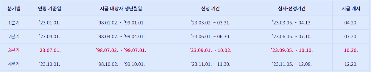 분기별 25만 원씩 최대 4분기에 걸쳐 100만 원까지 지원하기 때문에 분기별 지급 대상자 생년월일을 확인하여 신청하시길 바랍니다.