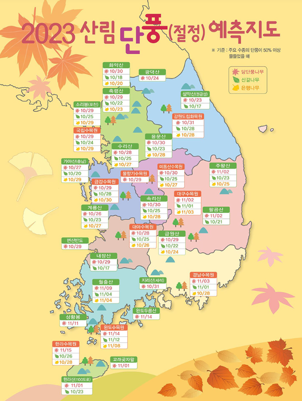 - 강원도: 설악산(10/23), 오대산(10/20)