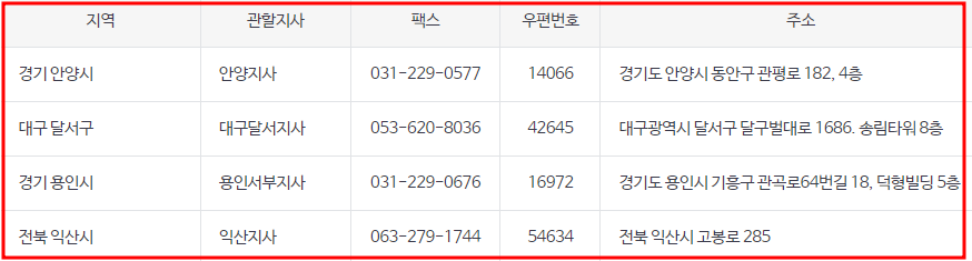 > 관할지사: 안양지사, 대구달서지사 방문, 우편 또는 팩스 송신
