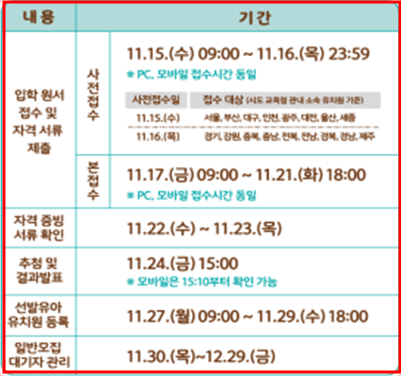 - 우선모집 대상자: 법정 저소득층 가정, 국가보훈대상자 가정, 북한이탈주민 가정