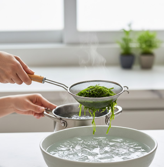 1분 이내 데치고 바로 찬물에 넣어주세요.