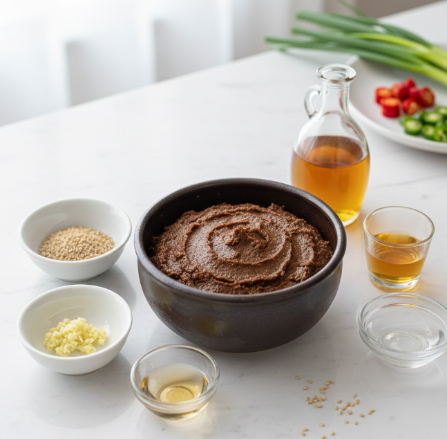 - 위의 양념장 재료(된장, 매실액, 다진 마늘, 참기름, 깨소금)를 모두 넣습니다.