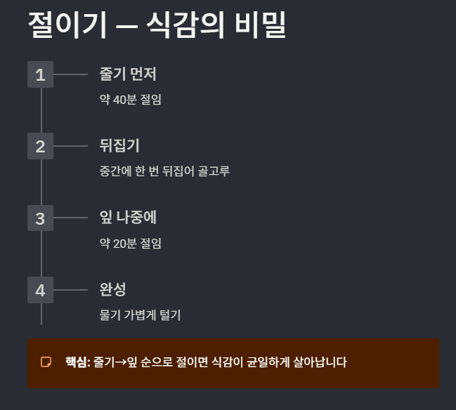 줄기는 약 40분, 잎은 20분 정도 절이고 중간에 한 번 뒤집어 골고루 간이 배도록 관리하면 좋습니다.