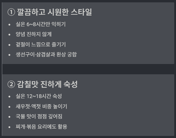 취향에 따라 숙성 변주가 가능해, 한 번 담글 때 두 방식으로 소량씩 나눠 두면 활용도가 훨씬 높습니다.