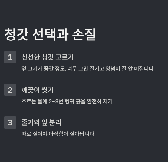 청갓김치 맛있게 담그는 핵심은 줄기·잎 따로 절이기, 농도 조절된 양념 비율, 아삭함 유지 버무림 방식, 그리고 숙성 스타일 선택입니다.