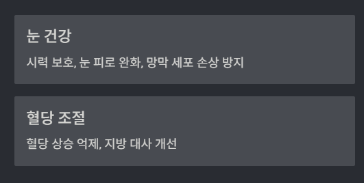 1. 영양 보조 관점에서는 항산화 성분이 풍부하여 눈 건강·피로 회복에 유리하며,