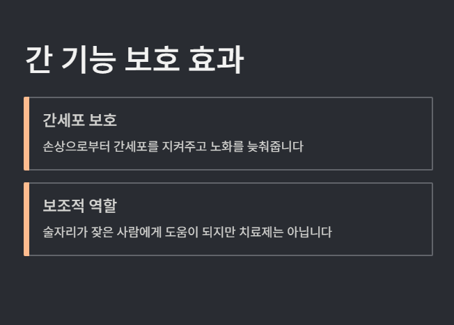 간세포를 손상으로부터 지켜주고 노화를 늦춰준다는 연구들이 있으며, 술자리가 잦은 사람에게 도움이 될 수 있습니다.