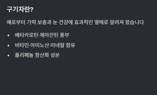 구기자는 비타민, 아미노산, 미네랄이 고르게 포함되어 있어 떨어진 체력을 보충하는 데 도움을 줍니다.