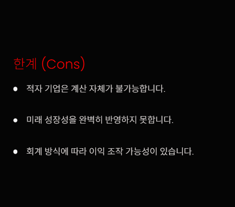 반면 성장 가치가 충분한 기업이나 일시적 요인으로 실적이 흔들리는 기업은 PER만으로 정확한 판단을 하기가 어렵습니다.