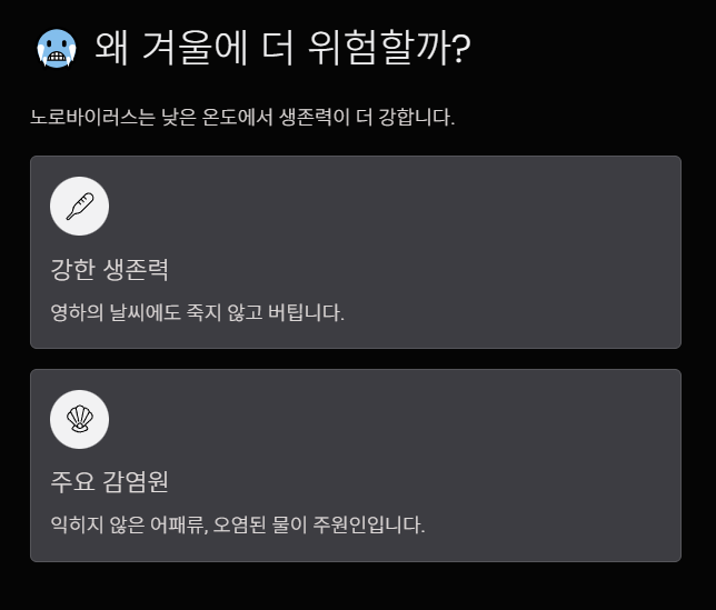 | 노로바이러스 주 발생 시기 | 11월 ~ 이듬해 4월 | 가열하여 섭취 | 저온에서 생존력이 강해 특히 주의해야 합니다. |