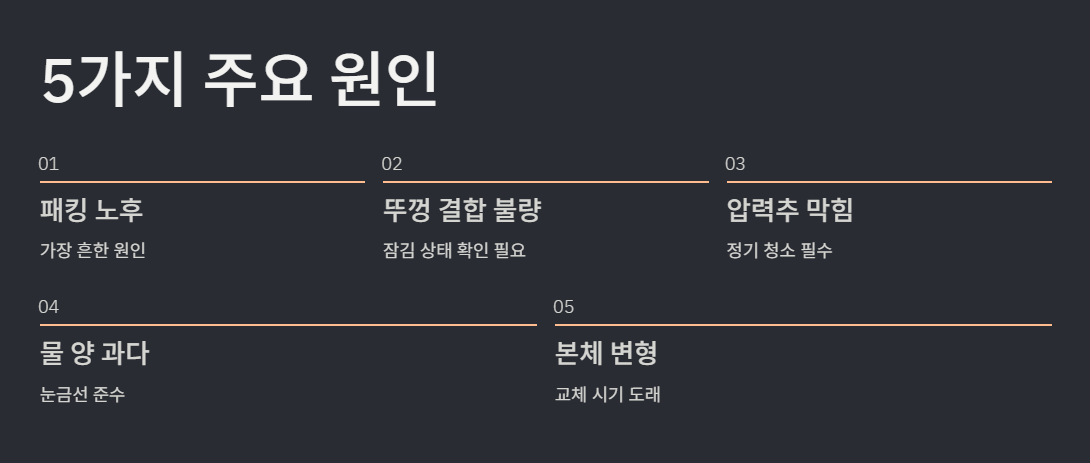 김이 새는 이유는 대부분 패킹 노후, 뚜껑 결합 문제, 밸브 막힘, 수분 과다, 본체 변형 중 하나입니다.