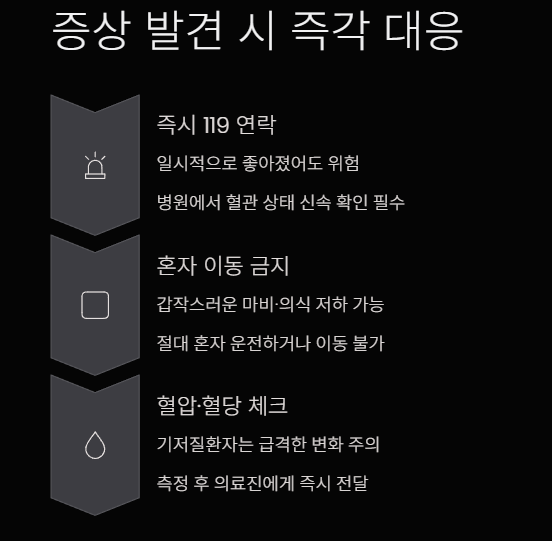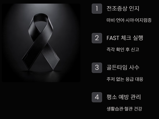 한쪽 마비, 언어장애, 시야 변화 등 초기 신호를 기억하고 즉시 대응하면 후유증을 크게 줄일 수 있습니다.