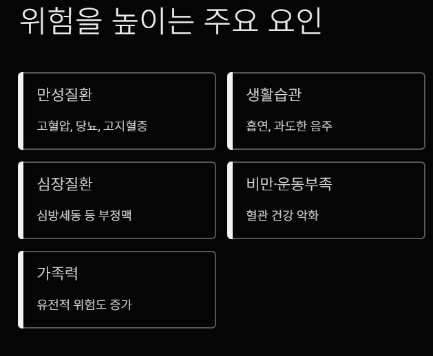 이러한 위험요인은 혈관 건강을 떨어뜨리고 뇌혈류 장애를 촉발할 가능성을 높여 지속적인 관리가 필요합니다.