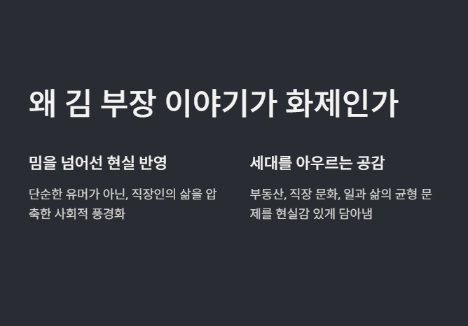 서울 부동산, 대기업 조직 문화, 중간관리자 세대의 고민 등 현대 사회의 구조를 반영한 콘텐츠로 해석하면 풍자와 메시지가 더욱 선명해집니다.