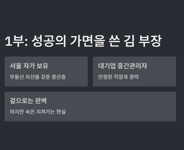 ● 1부 – 성공의 상징처럼 보이는 김 부장의 겉모습