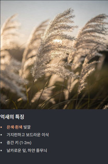 - 가을 감성의 정점, 억새: 억새는 척박한 땅에서도 잘 자라며 가을 산의 경관을 완성합니다. 특히 억새는 빛의 방향에 따라 은색, 흰색, 금색으로 시시각각 변하며 등산객들에게 시각적인 치유(Healing)를 제공합니다. 또한 과거에는 초가집의 지붕을 잇는 재료로 사용되는 등 우리 민족의 삶과 밀접한 실용적 가치도 지니고 있었습니다.