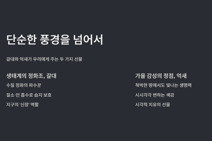 갈대는 물가에 사는 갈색 식물로 수질을 정화하고, 억새는 산에 사는 은빛 식물로 아름다운 가을 경관을 만듭니다.
