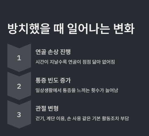 반대로 초기 단계에서 관리하면 통증 완화는 물론, 진행 속도를 늦출 수 있다는 점에서 조기 대응이 중요합니다.