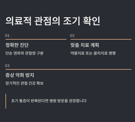단순 염좌와 관절염은 관리 방법이 다르기 때문에, 조기 진단이 장기적인 관절 건강을 좌우합니다.